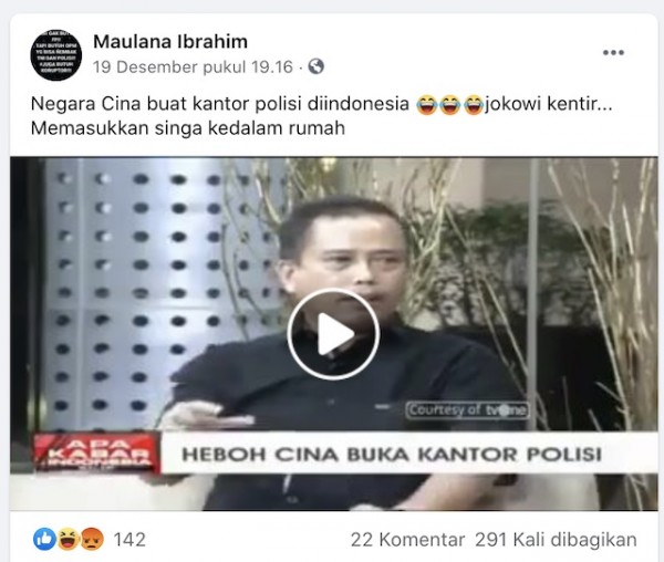 Beredar sebuah video yang diklaim berisi kabar bahwa Tiongkok telah membuat kantor polisi di Indonesia. Video itu beredar di media sosial. Akun Facebook Maulana Ibrahim membagikan video tersebut ke grup publik RELAWAN ANIES SANDI yang memiliki anggota sebanyak 76,5 ribu akun, pada Sabtu 19 Desember 2020.