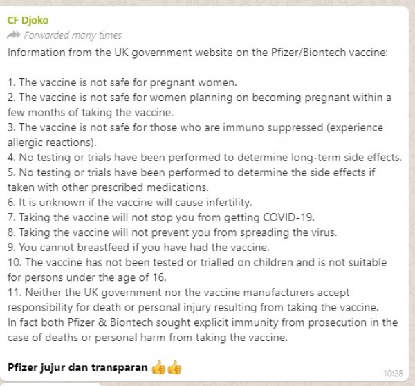 Beredar pesan berantai dari Pemerintah Inggris mengenai bahaya penggunaan vaksin covid-19 Pfizer / Biontech. Pesan berantai ini beredar dalam Bahasa Inggris. Berikut isi peringatan yang telah kami terjemahkan ke Bahasa Indonesia. "Informasi dari situs Pemerintah Inggris tentang vaksin Pfizer / Biontech: 1. Vaksin tidak aman untuk wanita hamil. 2. Vaksin tidak aman untuk wanita yang berencana hamil dalam beberapa bulan setelah divaksin. 3. Vaksin tidak aman untuk mereka yang mengalami reaksi alergi. 4. Tidak ada pengujian atau uji coba yang dilakukan untuk menentukan efek samping jangka panjang. 5. Tidak ada pengujian atau uji coba yang dilakukan untuk menentukan efek samping jika dikonsumsi dengan obat resep lain. 6. Tidak diketahui apakah vaksin akan menyebabkan kemandulan. 7. Vaksin tidak akan menghentikan Anda tertular Covid-19. 8. Vaksin tidak akan mencegah Anda menyebarkan virus. 9. Anda tidak bisa menyusui jika sudah divaksinasi. 10. Vaksin ini belum pernah diuji atau diujicobakan pada anak-anak dan tidak cocok untuk orang di bawah usia 16 tahun. 11. Baik pemerintah Inggris maupun produsen vaksin tidak bertanggung jawab atas kematian atau cedera diri akibat penggunaan vaksin."