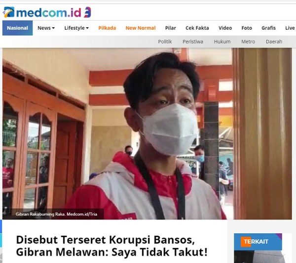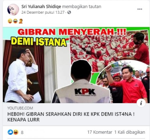Beredar sebuah video berjudul putra sulung Presiden Joko Widodo, Gibran Rakabuming Raka menyerahkan diri ke Komisi Pemberantasan Korupsi (KPK). Video beredar di kanal youtube 651 SAFA. Video berjudul "HEB0H! GIBRAN SERAHKAN DIRI KE KPK DEMI IST4NA ! KENAPA LURR". Video diunggah pada 22 Desember 2020. Video telah ditonton 418 ribu orang. Video ini dibagikan ulang di akun youtube bernama Sri Yulianah Shidiqie pada 24 Desember 2020. Dalam video tersebut mencatut pernyataan Wakil Ketua Umum Partai Demokrat Benny K Harman yang meminta KPK menyelidiki aliran dana korupsi bansos ke parpol tertentu dan pilkada serentak.