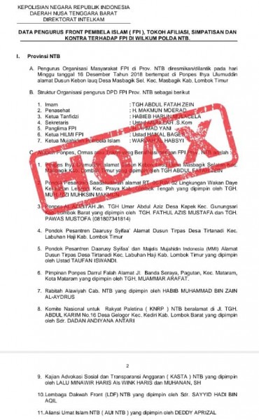 Beredar pada Whatsapp surat yang di dalamnya terdapat data pengurus FPI, tokoh afiliasi, simpatisan dan kontra terhadap FPI di wilayah hukum Polda NTB yang mencatut Direktorat Intelkam NTB. NARASI:“KEPOLISIAN NEGARA REPUBLIK INDONESIADAERAH NUSA TENGGARA BARATDIREKTORAT INTELKAMDATA PENGURUS FRONT PEMBELA ISLAM (FPI), TOKOH AFILIASI, SIMPATISAN DAN KONTRA TERHADAP FPI DI WILKUM POLDA NTB.I. Provinsi NTBA. Pengurus Organisasi Masyarakat FPI di Provinsi. NTB diresmikan/dilantik pada hari Minggu tanggal 16 Desember Tahun 2018 bertempat di Ponpes Ihya Ulumuddin alamat Dusun Kebon lauq Desa Masbagik Sel. Kec. Masbagik Kab. Lombok TimurB. Struktur Organisasi pengurus DPD FPI di Prov. NTB sebagai berikut Imam : TGH ABDUL FATTAH ZEIN Penasehat: H. MAKMUM MOERAD Ketua Tanfidzi: HABIEB HARUN MULACELA Sekertaris: Ustad AMRILLAH .S.Kom Panglima FPI: H. AHMAD YANI Ketua HILMI FPI: Ustad BAKAL BAGES Ketua Mujahidah Pembela Islam: WARDAH AL HABSYI”Selengkapnya digambar