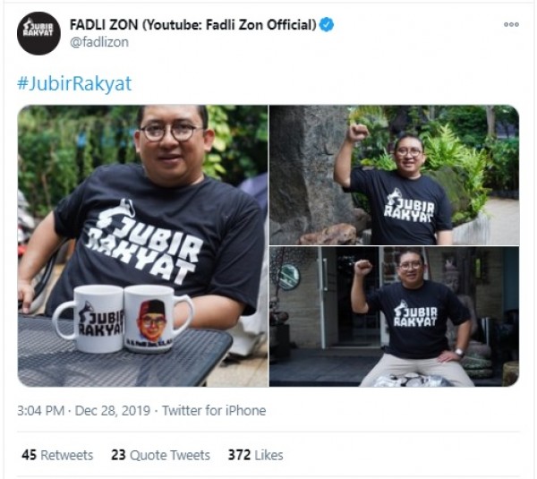 Beredar sebuah foto politikus Partai Gerindra memakai kaos bertuliskan jubir bok*p. Hal ini dikaitkan dengan akun twitter @fadlizon yang memberi tanda like ke akun konten video dewasa. Akun facebook atas nama Sulis Jaker membagikan foto ini pada 7 Januari 2020. Dalam unggahannya ia memberikan narasi sebagai berikut. "Ini kata yang tepat untuk Fadli Zon, dasar munafik. Ibu Risma belusukan karena bekerja dia nyinyirin sementara fadli Zon duduk santai di senayan lihat bokep pakai fasilitas negara. Gila kan"