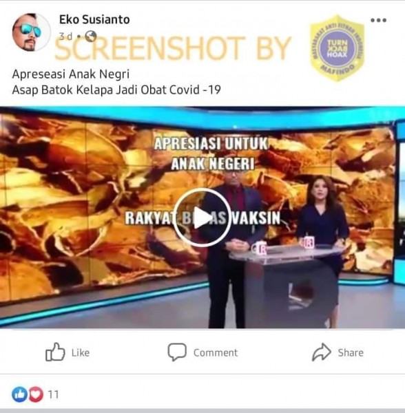 Beredar unggahan di sosial media Facebook yang menyatakan bahwa telah terdapat obat Covid-19 yang dihasilkan melalui kondensasi asap batok kelapa. Unggahan milik akun Facebook Eko Susianto ini juga disertai dengan video berita yang menayangkan proses pembuatan batok kelapa menjadi obat Covid-19. NARASI:“Apreseasi anak negriAsap batok kelapa jadi obat Covid-19?