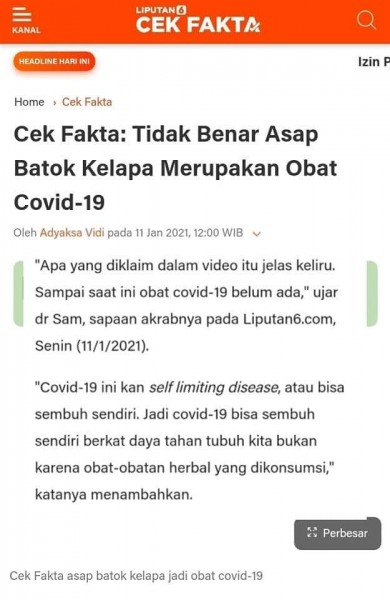 Sumber: www.liputan6.com/cek-fakta/read/4454097/cek-fakta-tidak-benar-asap-batok-kelapa-merupakan-obat-covid-19