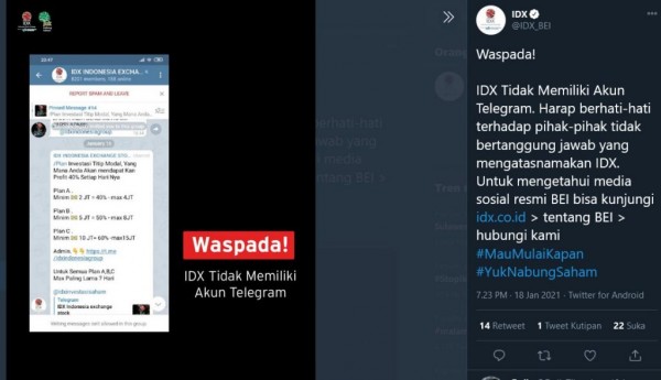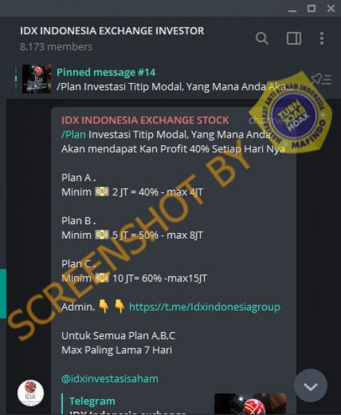 Beredar akun Indonesia Stock Exchange (IDX) di Telegram. Beberapa di antaranya bernama IDX Indonesia Exchange Stock (@Idxindonesiagroup), IDX INDONESIA EXCHANGE INVESTOR (t.me[slash]IDXinvestasisahamgroup), INDONESIA EXCHANGE STOCK (@idxinvestasisaham). Postingan yang diunggah dalam akun tersebut berisi seputar promosi investasi di pasar modal. NARASI:IDX INDONESIA EXCHANGE INVESTOR/Plan Investasi Titip Modal, Yang Mana Anda Akan mendapat Kan Profit 40% Setiap Hari NyaPlan A .Minim ????2 JT = 40% – max 4JTPlan B .Minim ????5 JT = 50% – max 8JTPlan C .Minim ????10 JT= 60% -max15JTAdmin.????????https://t.me/IdxindonesiagroupUntuk Semua Plan A,B,CMax Paling Lama 7 Hari@idxinvestasisaham