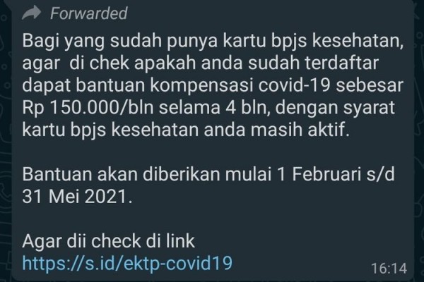 Beredar pesan yang berisi tentang kompensasi Covid-19 Rp150.000 per bulan bagi peserta BPJS Kesehatan. Bantuan akan diberikan mulai 1 Februari s/d 31 Mei 2021. Dalam pesan itu juga terdapat link yang harus diklik.Berikut ini narasi yang beredar:"Bagi yang sudah punya kartu BPJS Kesehatan, agar dicek apakah anda sudah terdaftar dapat bantuan kompensasi Covid-19 sebesar Rp 150.000/bulan selama 4 bulan, dengan syarat kartu BPJS Kesehatan anda masih aktif. Bantuan akan diberikan mulai 1 Februari s/d 31 Mei 2021. Agar dicek di link: https://s.id/ektp-covid19."