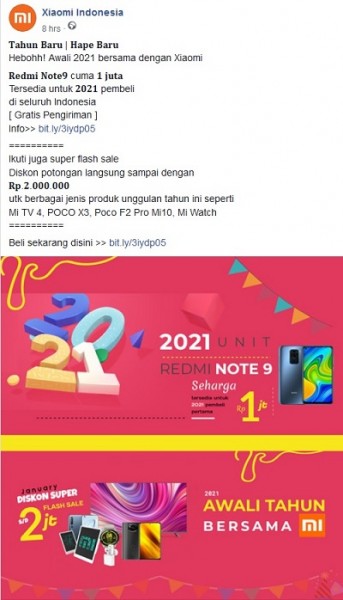 Beredar sebuah postingan dari akun Facebook Xiaomi Indonesia memposting promosi sebuah event seperti harga tahun baru serta flash sale produk dari Xiaomi, pada postingan tersebut terlampir sebuah link yang menuju website xiaomi-co[dot]id untuk melakukan pembelian dan transaksi dari event tersebut dan diketahui website dan akun tersebut telah dihapus. NARASI:“???????????????????? ???????????????? | ???????????????? ????????????????Hebohh! Awali 2021 bersama dengan Xiaomi???????????????????? ???????????????????? cuma ???? ????????????????Tersedia untuk ???????????????? pembelidi seluruh Indonesia[ Gratis Pengiriman ]Info>> bit[dot]ly/3iydp05Ikuti juga super flash saleDiskon potongan langsung sampai dengan????????.????.????????????.????????????utk berbagai jenis produk unggulan tahun ini sepertiMi TV 4, POCO X3, Poco F2 Pro Mi10, Mi WatchBeli sekarang disini >> bit[dot]ly/3iydp05”