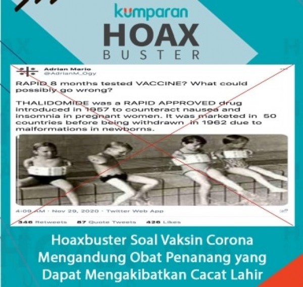 Sebuah unggahan berisi foto lawas disertai narasi di media sosial menyebut vaksin Pfizer akan menyerupai tragedi Thalidomide yang pernah terjadi pada tahun 1950-an. Dimana ribuan ibu hamil yang menggunakan obat tersebut dan mengakibatkan bayi mereka lahir dengan kondisi cacat.