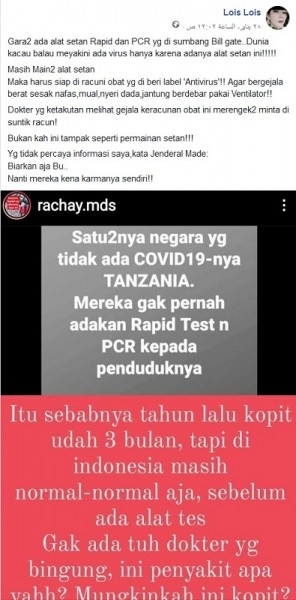 Akun Lois Lois (fb.com/lois.lois.501) pada 28 Januari 2021 mengunggah sebuah gambar tangkapan layar status Instagram akun @rachay.mds yang berisi klaim “Satu2nya negara yg tidak ada COVID19-nya TANZANIA. Mereka gak pernah adakan Rapid Test n PCR kepada penduduknya” dan “Itu sebabnya tahun lalu kopit udah 3 bulan. tapi di indonesia masih normal-normal aja. sebelum ada alat tes Ga ada tuh dokter yang bingung, ini penyakit apa yahh? Mungkinkah ini kopit?”Akun Lois Lois menambahkan narasi sebagai berikut:“Gara2 ada alat setan Rapid dan PCR yg di sumbang Bill gate..Dunia kacau balau meyakini ada virus hanya karena adanya alat setan ini!!!!! Masih Main2 alat setanMaka harus siap di racuni obat yg di beri label ‘Antivirus’!! Agar bergejala berat sesak nafas,mual,nyeri dada,jantung berdebar pakai Ventilator!! Dokter yg ketakutan melihat gejala keracunan obat ini merengek2 minta di suntik racun! Bukan kah ini tampak seperti permainan setan!!!Yg tidak percaya informasi saya,kata Jenderal Made: Biarkan aja Bu.. Nanti mereka kena karmanya sendiri!!”