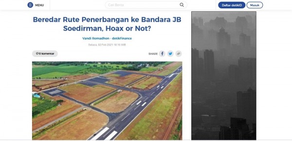 Kepala Dinas Perhubungan Kabupaten Purbalingga Yani Sutrisno UN ketika dikonfirmasi mengaku kaget. Sebab, sepengetahuannya Bandara Jenderal Soedirman Purbaingga belum membuka atau meayani rute pesawat dari Jakarta ke Purbalingga atau jurusan manapun. “Kemarin (baru-baru ini, red), baru survei yang diakukan oleh Dirjen Perhubungan Udara Kemenhub. Nantinya masih akan dievaluasi apakah layak untuk melayani penerbangan atau tidak. Jika layak maka baru keluar izin operasional. Selanjutnya, baru ditawarkan rute ke Bandara Jenderal Soedirman oleh Kemenhub kepada maskapai,” jelasnya. Yani memastikan, beredarkan informasi harga tiket maskapai penerbangan dari Jakarta ke Purbalingga berita bohong (hoax). Hal itu diperkuat oleh perwakilan PT Angkasa Pura II di Purbalingga, selaku operator Bandara Jenderal Besar Soedirman. Sementara itu, berdasarkan penelusuran melalalui Google. Daftar harga tiket pesawat itu bukan rute Jakarta-Purbalingga. Tapi peringkat penawaran terbaik. Hasil pencarian google yang keluar ialah rute penerbangan dari Jakarta menuju bandara terdekat Kabupaten Purbalingga. Dalam hal ini, nama bandara yang muncul adalah Bandar Udara Internasional Yogyakarta (YIA). Sehingga unggahan tersebut tidak benar. Hal ini merupakan kesalahan mengartikan hasil pencarian google tentang harga tiket pesawat Jakarta-Purbalingga. (tya)
