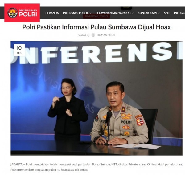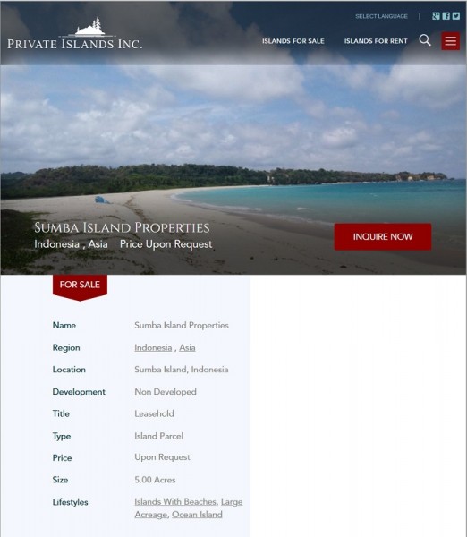 Situs Private Island Online (privateislandsonline[dot]com) terlihat mencantumkan Pulau Sumba beserta fotonya dengan narasi yang menyatakan bahwa Pulau Sumba dijual berdasarkan harga yang ditawar pembeli.Berikut narasi yang tercantum di situs tersebut:“Sumba Island PropertiesIndonesia , Asia Price Upon RequestFOR SALE”