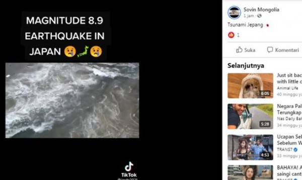 Beredar video yang menyebutkan gempa di Jepang bermagnitudo 8.9. Informasi itu juga menyebutkan bahwa gempa di Jepang berpotensi tsunami."MAGNITUDO 8.9 EARTHQUAKE IN JAPAN."Kemudian pengunggah menuliskan narasi:"OMG TSUNAMI WARNING IN JAPAN".