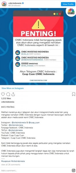 Beredar di aplikasi percakapan Telegram akun mengatasnamakan CNBC Indonesia. Akun tersebut mengajak pengguna lain untuk berinvestasi dengan keuntungan menggiurkan.Beberapa nama akun palsu yang dipakai di Telegram adalah @cnbc_id, @CNBCINVESTASIINDONESIA, dan @cnbc_investasi. Bahkan akun tersebut mempunyai anggota lebih dari tiga ribu pengguna.Dalam akun tersebut menjanjikan keuntungan yang menggiurkan jika mau berinvestasi. Keuntungannya pun cukup menggiurkan yakni jika ada yang berinvestasi Rp 5 juta maka akan memperoleh profit hingga 50 persen.