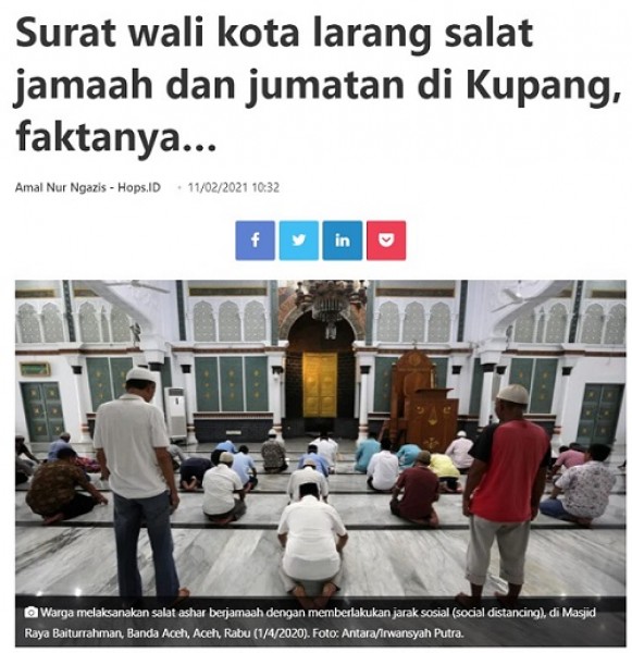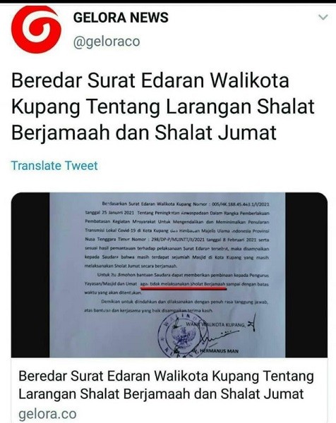 Sumber: www.medcom.id/telusur/cek-fakta/9K5566xK-cek-fakta-surat-edaran-wali-kota-kupang-melarang-salat-berjamaah-ini-faktanya