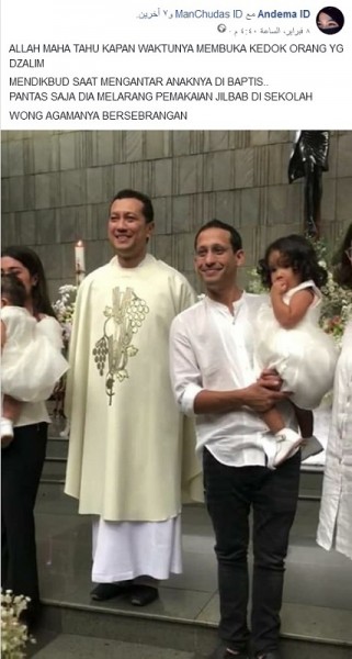 Beredar sebuah postingan dari akun Facebook Andema ID memposting sebuah gambar yang diketahui adalah Nadiem Makarim dengan narasi berisikan klaim bahwa Nadiem melarang pemakaian jilbab di sekolah. NARASI:“ALLAH MAHA TAHU KAPAN WAKTUNYA MEMBUKA KEDOK ORANG YG DZALIMMENDIKBUD SAAT MENGANTAR ANAKNYA DI BAPTIS..PANTAS SAJA DIA MELARANG PEMAKAIAN JILBAB DI SEKOLAHWONG AGAMANYA BERSEBRANGAN”