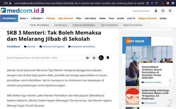 Berdasarkan artikel dari tirto.id, tiga Menteri Jokowi yaitu Ketiga Menteri Pendidikan dan Kebudayaan Nadiem Makarim, Menteri Dalam Negeri Tito Karnavian, dan Menteri Agama Yaqut Cholil Qoumas menandatangani dan menerbitkan regulasi baru. Aturan tersebut melarang memaksa dan mewajibkan pemakaian seragam agama tertentu yang berlaku untuk siswa hingga guru di sekolah negeri.“Institusi sekolah tidak boleh lagi mewajibkan siswa maupun tenaga kependidikan menggunakan seragam dengan atribut keagamaan tertentu. Agama apa pun itu. Penggunaan seragam sekolah dengan atribut keagamaan di sekolah negeri merupakan keputusan murid dan guru sebagai individu,” kata Nadiem Makarim pada saat penandatangan Surat Keputusan Bersama (SKB) Tiga Menteri pada 3 Februari 2021.Isi Surat dari SKB 3 menteri terdiri dari 6 aturan, yaitu: Regulasi seragam hanya berlaku untuk sekolah negeri yang diselenggarakan pemerintah daerah; Peserta didik, pendidik dan tenaga kependidikan berhak memilih antara: a) seragam dan atribut tanpa kekhususan agama, atau b) seragam dan atribut dengan kekhususan agama; Pemerintah daerah dan sekolah tidak boleh mewajibkan ataupun melarang seragam dan atribut dengan kekhususan agama; Pemerintah daerah dan kepala sekolah wajib mencabut aturan yang mewajibkan atau melarang seragam dan atribut dengan kekhususan agama paling lama 30 hari kerja sejak keputusan bersama ini ditetapkan; Jika terjadi pelanggaran terhadap keputusan bersama ini, maka sanksi akan diberikan kepada pihak yang melanggar: a) Pemerintah daerah memberikan sanksi kepada kepala sekolah, pendidik, dan/atau tenaga kependidikan. b) Gubernur memberikan sanksi kepada bupati/wali kota. Kemendagri memberikan sanksi kepada gubernur Kemendikbud memberikan sanksi kepada sekolah terkait Bantuan Operasional Sekolah dan bantuan pemerintah lainnya. c) Tindak lanjut atas pelanggaran akan dilaksanakan sesuai dengan mekanisme yang berlaku. d) Kemenag melakukan pendampingan praktik agama yang moderat dan dapat memberikan pertimbangan untuk pemberian dan penghentian sanksi; Peserta didik, pendidik, dan tenaga kependidikan beragama Islam di Provinsi Aceh dikecualikan dari ketentuan SKB sesuai kekhususan Aceh berdasarkan ketentuan peraturan perundangundangan terkait pemerintahan Aceh.