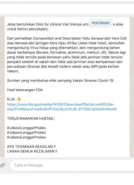 Beredar sebuah narasi bahwa vaksin Covid-19 buatan Sinovac mengandung bahan dasar berbahaya. Narasi ini beredar melalui pesan WhatsApp, baru-baru ini. Berikut narasinya: "Dan perhatikan Composition and Description Yaitu berasal dari Vero Cell atau berasal dari jaringan Kera hijau Afrika (Jelas tidak halal), kemudian mengandung Virus hidup yang dilemahkan, dan mengandung bahan dasar berbahaya (Boraks, formaline, aluminium, merkuri, dll)."