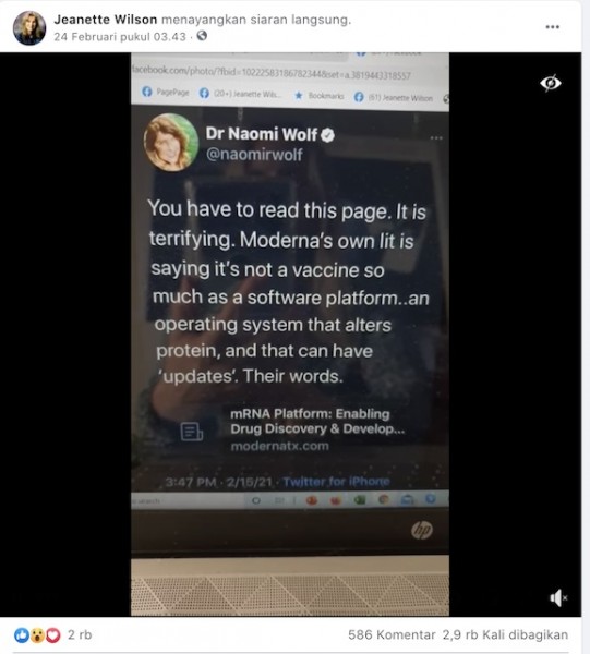 Beredar sebuah video yang diklaim berisi penjelasan terkait vaksin covid-19 produksi Moderna dirancang untuk mengubah DNA manusia. Video itu beredar di media sosial. Akun Facebook Jeanette Wilson membagikan video itu pada Rabu, 24 Februari 2021. Dalam video itu, terdengar suara seorang wanita membahas isi sebuah artikel yang diunggah akun Twitter @naomirwolf. Artikel tersebut berisi penjelasan mengenai penemuan dan pengembangan vaksin Moderna untuk melawan virus.